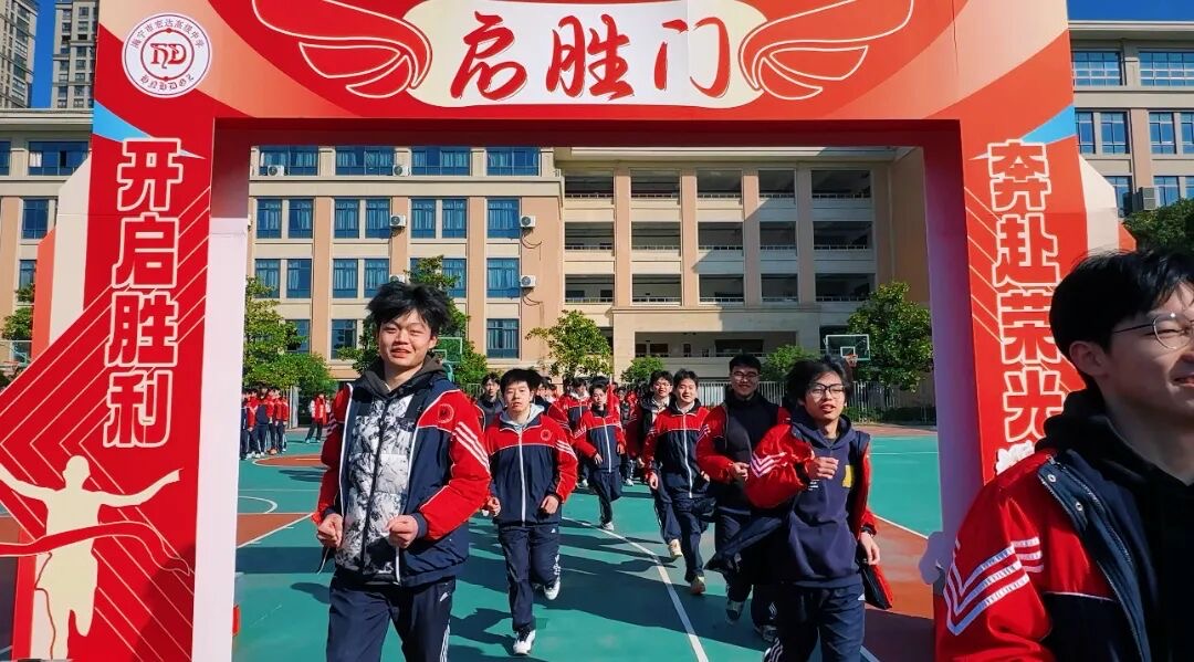 伴随着激昂的乐曲,高三学子在班主任带领下依次穿过寓意“开启胜利、奔赴荣光”的“启胜门”,彩旗飘扬,步伐坚定,雄壮的国歌声响彻全场,誓师大会正式拉开帷幕。