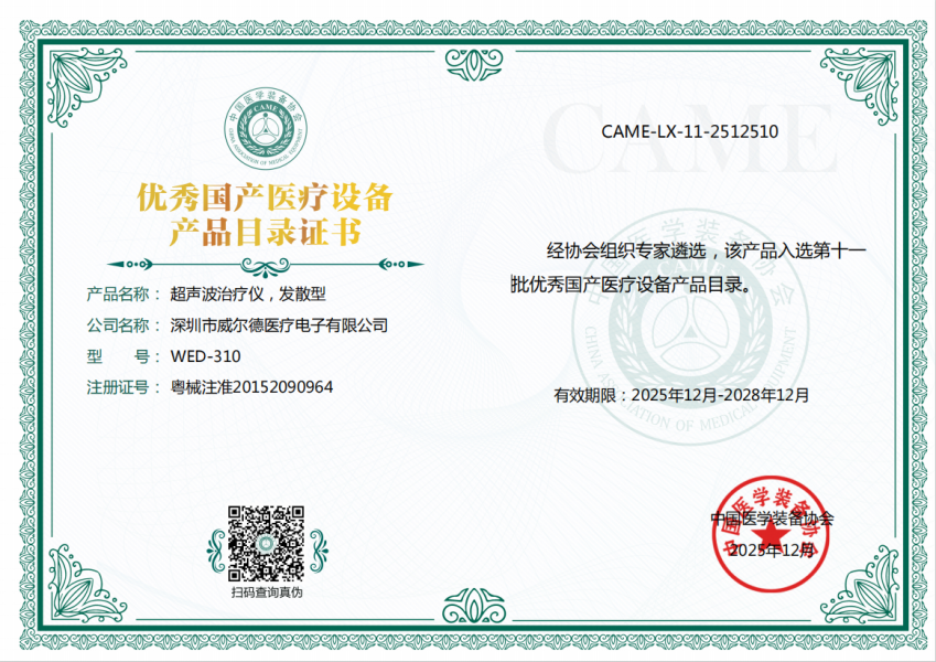 近日,中国医学装备协会正式颁发第十一批《优秀国产医疗设备产品目录》证书,深圳市威尔德医疗电子有限公司产品发散型超声波治疗仪WED310&WED310C凭借卓越的技术性能与可靠的临床价值,成功入选该权威目录。