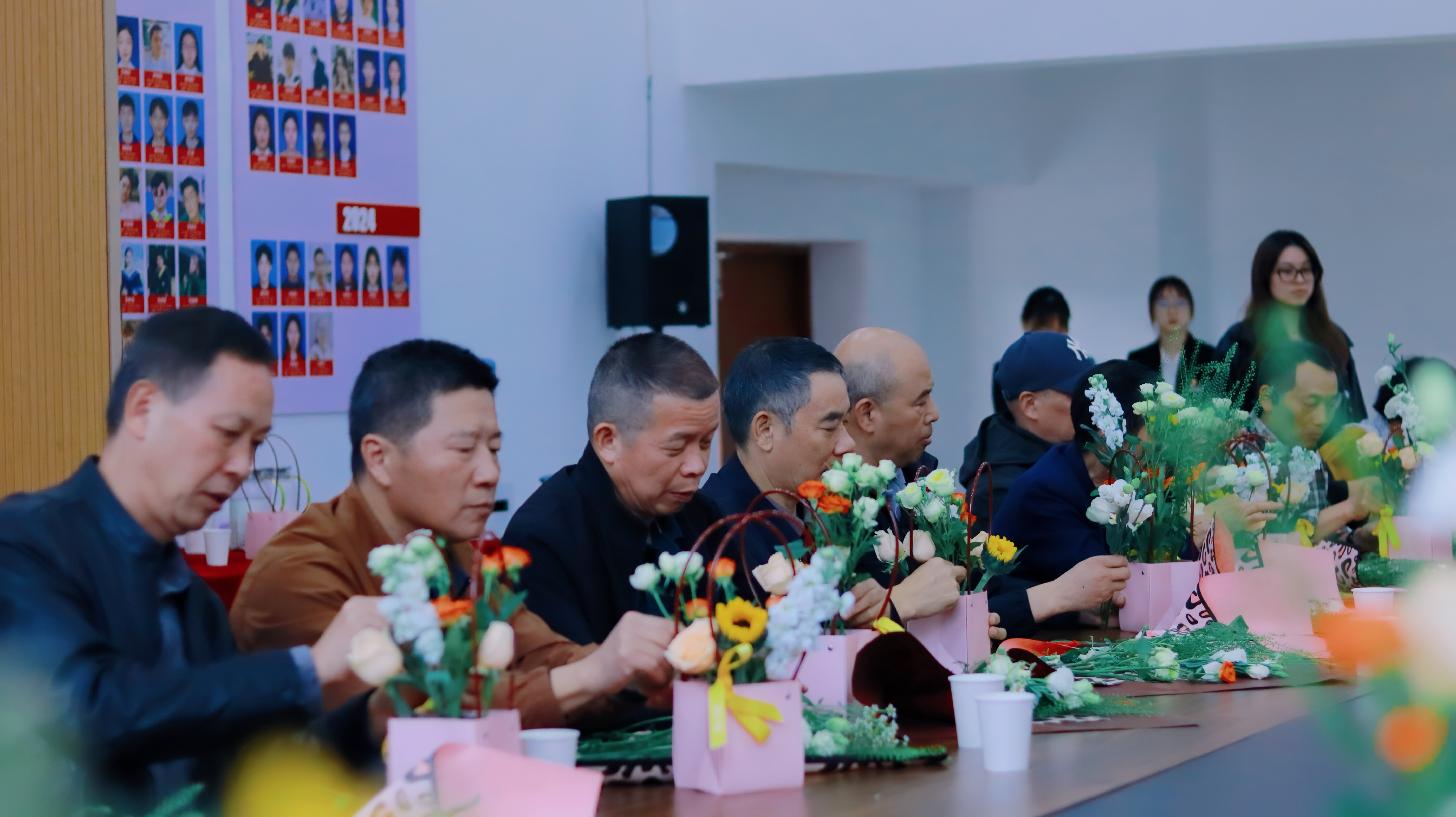 插花雅集环节,老教师们在专业指导下化身“花艺师”,将鲜艳的康乃馨、淡雅的菊花与灵动配叶巧妙搭配,创作各具特色的花篮,指尖流转间,一个个错落有致的花艺作品承载着大家对生活的热爱。